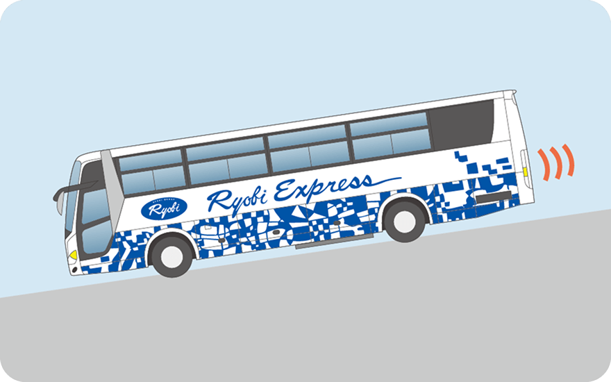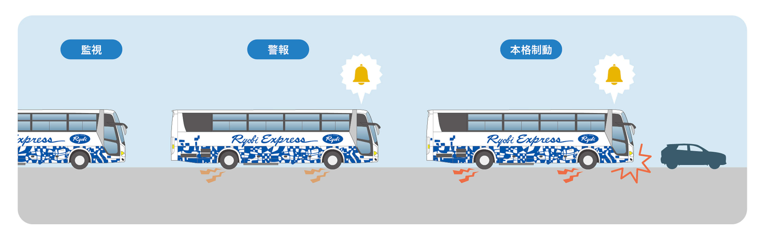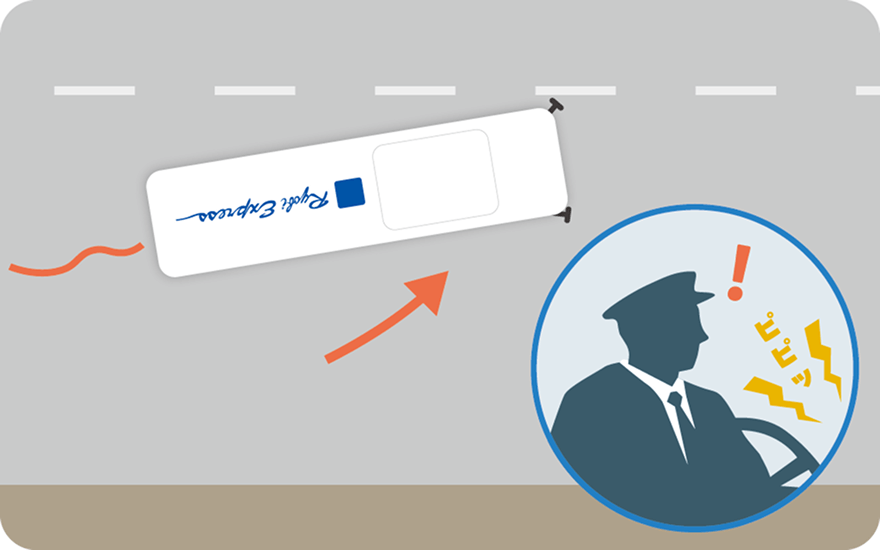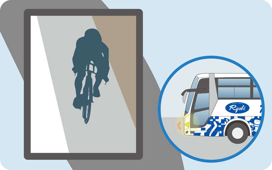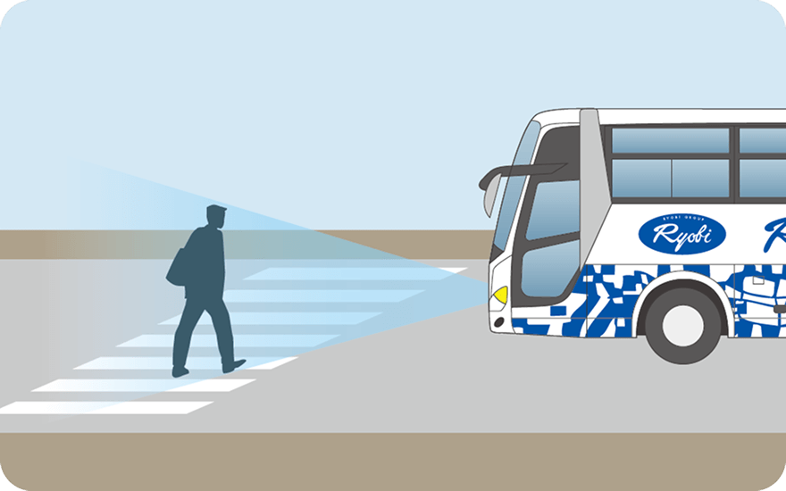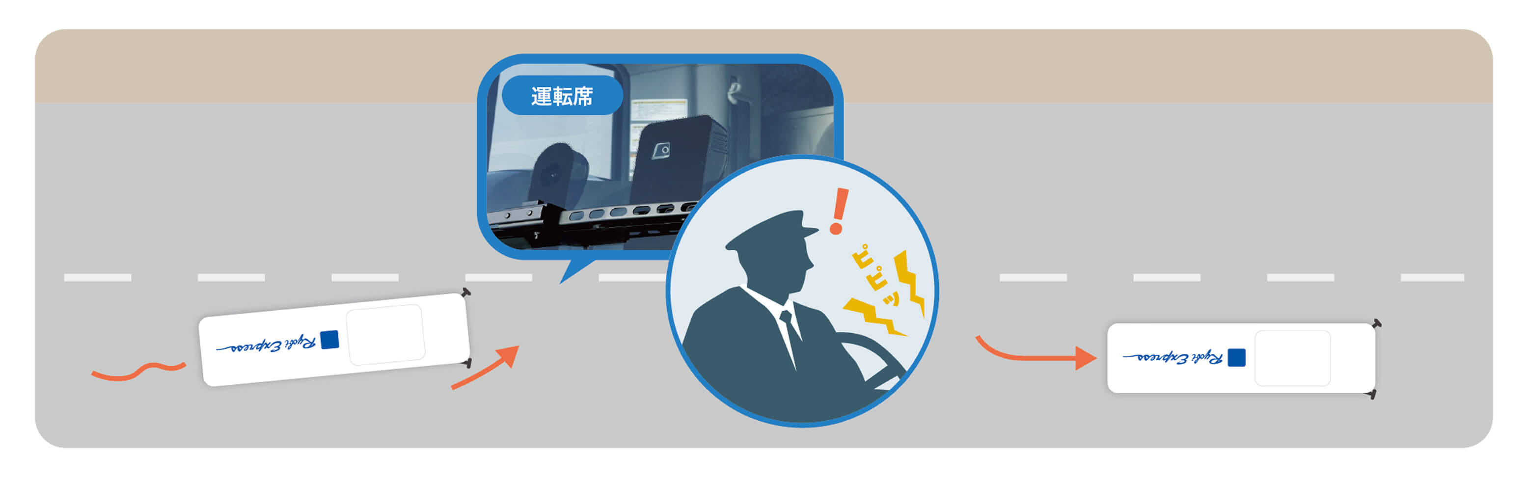 バスが車線を外れそうになると、モニター表示と運転席の振動でドライバーに注意を促します。安全運転をしっかりサポートする機能です。