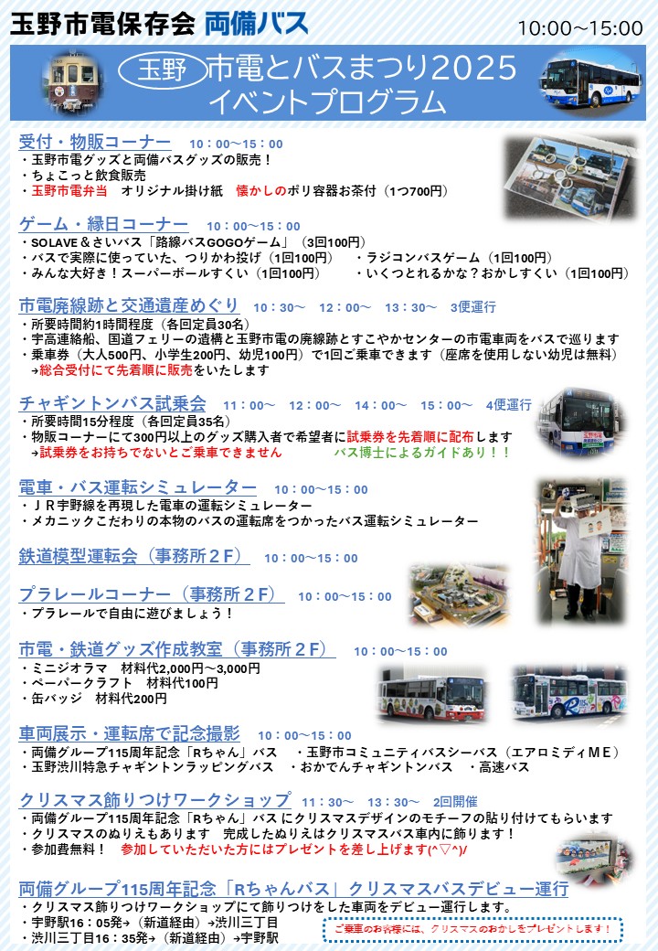 玉野市電保存会との共催でバスでめぐる玉野市電廃線跡ツアーや、クリスマスの飾り付けワークショップ、バス運転体験のシュミレーターなど、