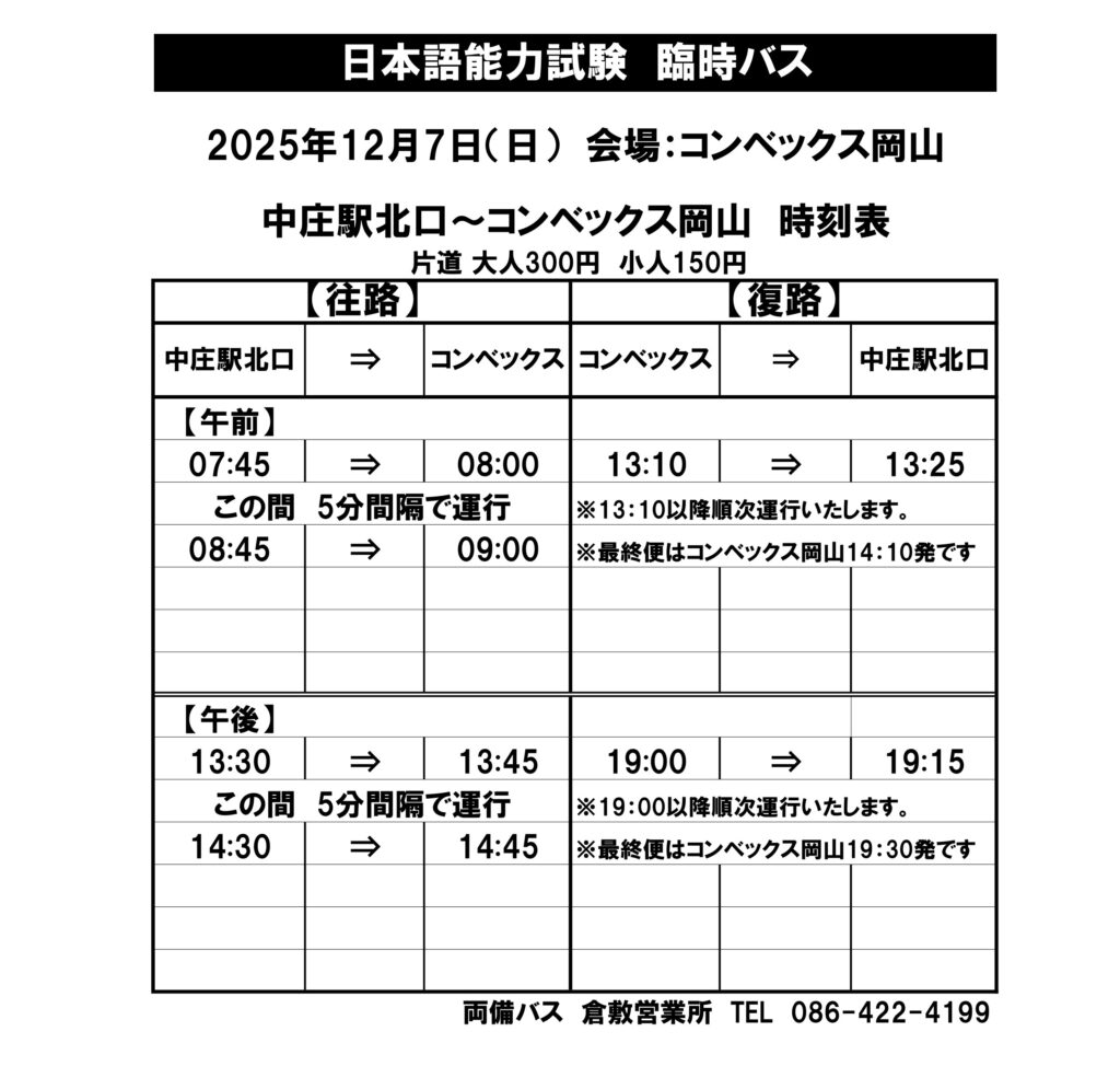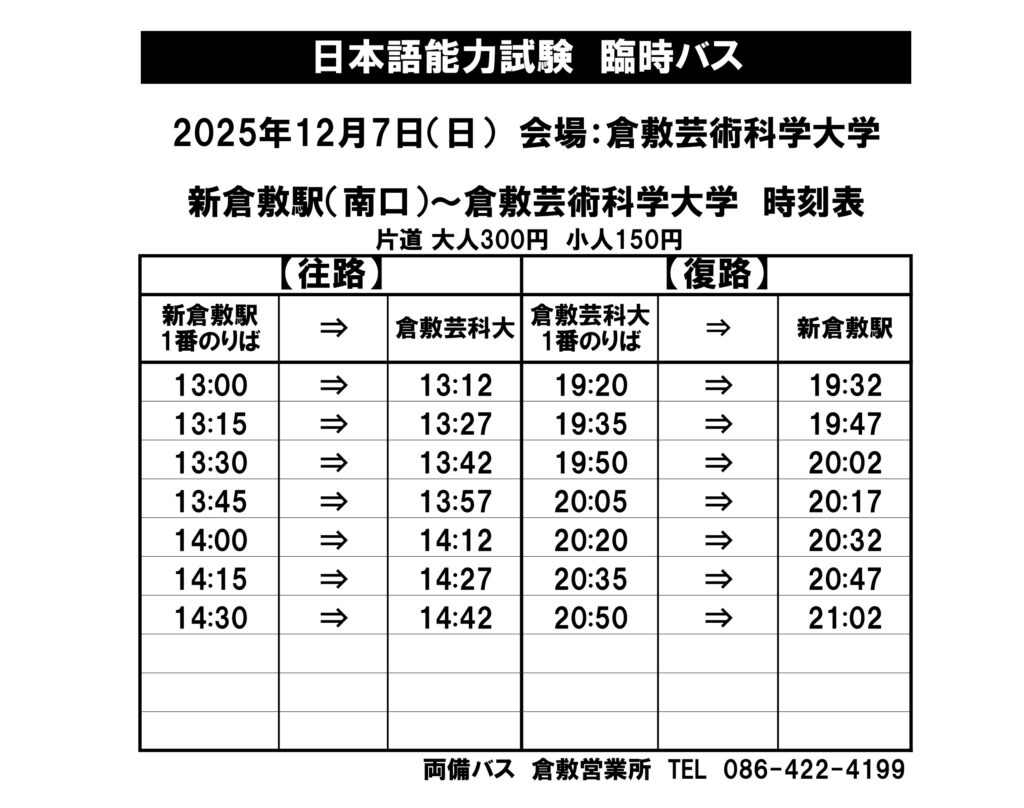 12月7日(日)日本語能力試験(convex岡山、倉敷芸術科学大学)臨時バス