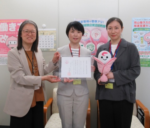 そして、2025年4月25日付で、新たに「不妊治療と仕事の両立に積極的に取り組み、一定の認定基準を満たした企業」として、「くるみんプラス」認定を取得しました。岡山県下では3社目の認定です。